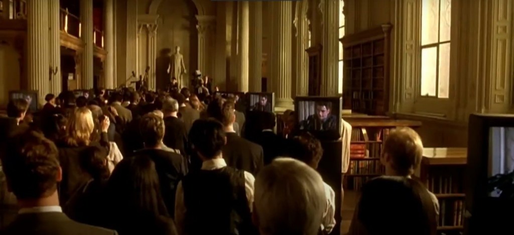 This sci-fi horror film follows an entomologist, Susan Tyler (Mira Sorvino), who creates a mutant breed of insects to kill off cockroaches carrying a disease which infects Manhattan children. These insects survive and evolve into monsters who can mimic human form. You may notice the Great Library in the press conference scene.