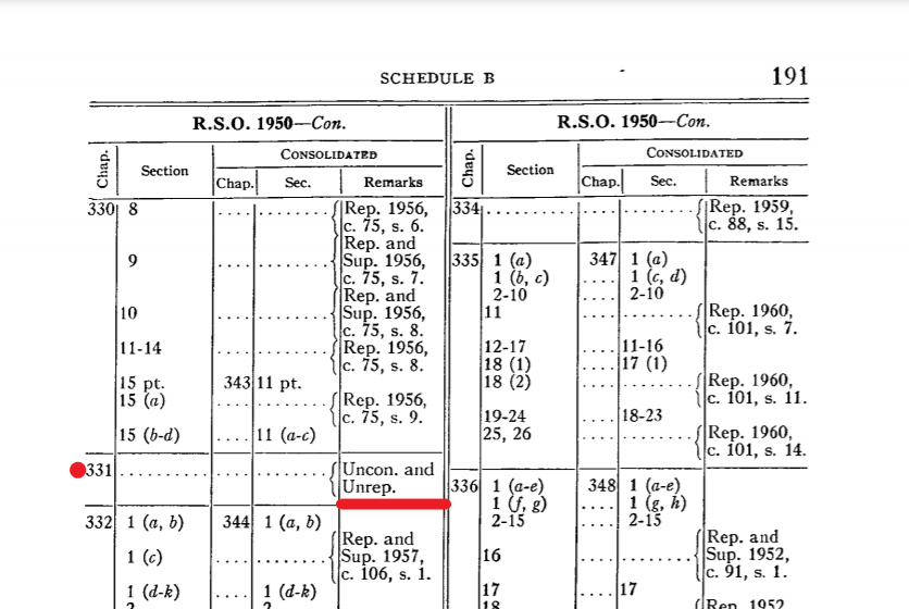 The mystery can be solved by checking the Table of Unconsolidated and Unrepealed Acts, Schedule B in the last volume of the RSO 1960. The schedule lists c 331 of the RSO 1950 as unconsolidated and unrepealed, and therefore still in effect in 1960.