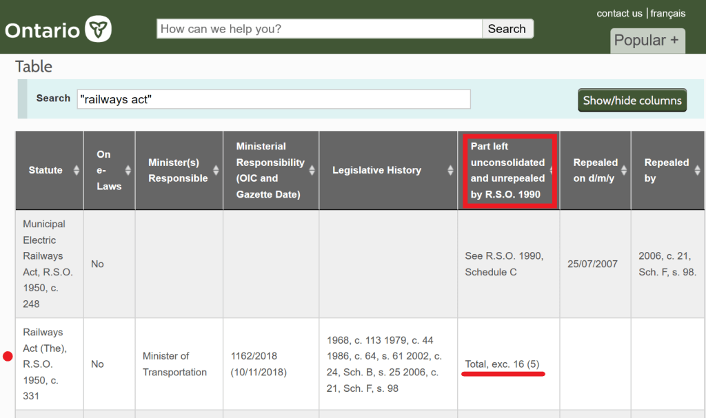 Tables of Unconsolidated and Unrepealed Acts were published in most older Ontario statute revisions. To update the status of the Railways Act further, check these tables in the RSO 1970, 1980 and 1990, or check the Public Statutes and Ministers Responsible table available on eLaws.