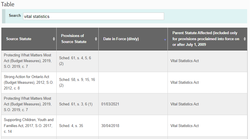 You may also use the Table to determine if a parent statute has any unproclaimed provisions. In the example below, searching for “vital statistics” brings up amendments that affect the Vital Statistics Act. The first two entries are not yet in force since the “Date in Force” column is left blank.