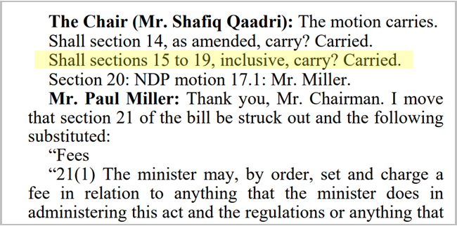 However, researchers must manage their expectations of Committee Hansard. While Committee Hansard can be a treasure trove of information about a particular provision of an Act, it may not address the Act’s other provisions – especially if they are non-controversial or not prioritized for discussion by the committee. For example, if you wanted to learn more about sections 15-19 of Bill 21, then the committee debates will not help you. When the Standing Committee on Social Policy reviewed Bill 21, they simply agreed on sections 15-19 with no further discussion (see screenshot below) [17].