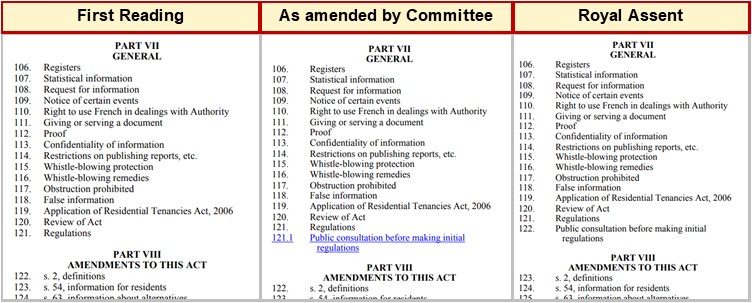 The numbering within a bill may shift as it passes through the house and committee. As an example, section 121.1 of Bill 21, Retirement Homes Act, 2010 was inserted at the committee stage, but the section was renumbered as 122 in the Royal Assent version (see comparison image below) [16].