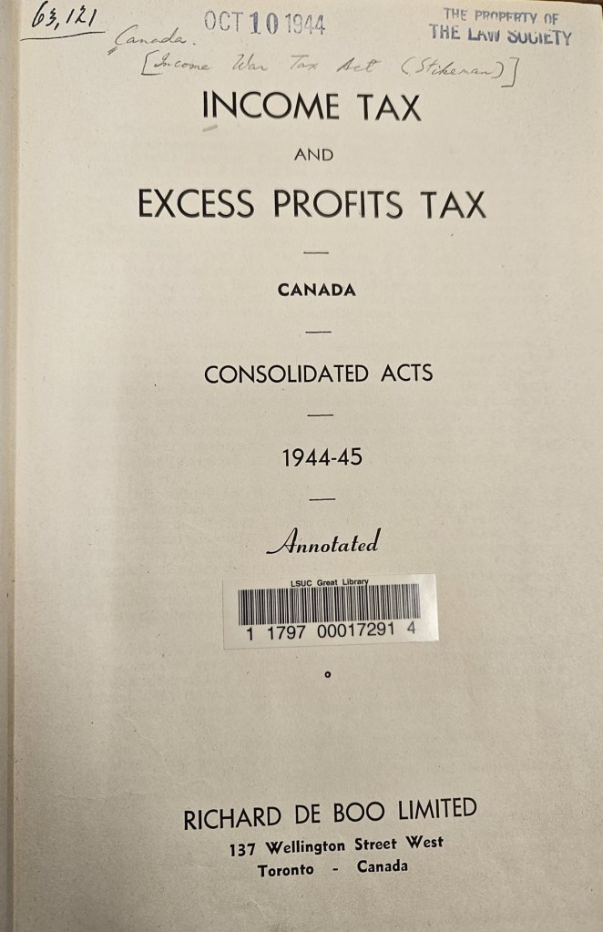 Two publications which frequently have their older editions referenced are Martin’s Annual Criminal Code (1955 – present) and Stikeman’s Income Tax Act Annotated (1944/5 – present). Given the complex nature of both the Criminal Code and the Income Tax Act, tracing back particular sections can be incredibly time consuming. Instead, it is much easier to consult the annual edition of either Martin’s or Stikeman’s to see how the act looked during a desired period of time. These annotated editions also come with extra information that is not available in the original act, such as legislative histories, citing case law, and citations to documents like instructional bulletins.