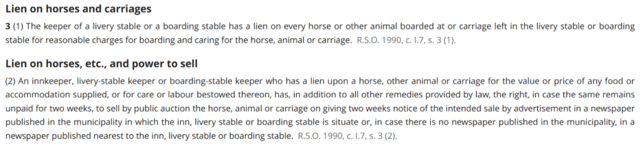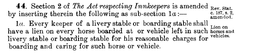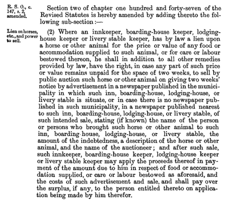 Unfortunately, we have now gone so far back in time that there are no official Hansards to explore in our attempt to discover why this section was first added. Instead, we have to look at Scrapbook Hansard, which are newspaper clippings of what reporters found interesting in the legislature from 1867 – 1946. I had a look at the Scrapbook Hansard from the period this statute was given royal assent, but predictably, no one found it interesting enough to report on. I can only imagine that the ability to put liens on horses was the same as someone putting a lien on a car: just in case they didn’t want to pay the innkeeper for their services.